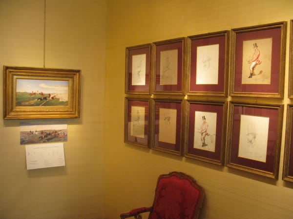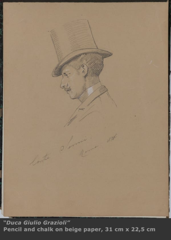 I ritratti ad acquerello ora recuperati si riferiscono ai duchi Giulio e Mario Grazioli, il marchese Pizzardi, il duca Braschi, il conte Benckendorff, il principe Odescalchi, il marchese Origo, il marchese Calabrini e il conte Senni quali compaiono nel grande dipinto ad olio Caccia alla volpe nella Campagna romana (cm 100 x 217), dove, al seguito del principe ereditario Umberto, lungo i dolci declivi della Campagna romana, sono impegnati nella caccia alla volpe, scena inquadrata in un’ ampia composizione significativamente delimitata a sinistra da un tipico fontanile e a destra dalle arcate degli antichi acquedotti.